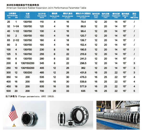 上海淞江減震器集團有限公司網站為您介紹:【ANSI】DN100美標橡膠膨脹節信息,淞江集團為眾多客戶提供美標型橡膠管接頭產品,主要采用美標150LB法蘭標準,橡膠采用長度130mm標準,具有良好的減震和降噪效果。